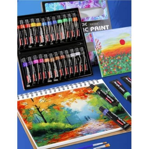 24 High Quality Vivid Colors in 12ml Tubes: A selection of unique eye-catching vibrant water-based acrylic colors that allow you to create stunning vivid masterpieces. They're ideal for use by beginners, professional artists, as well as the young aspiring artist.