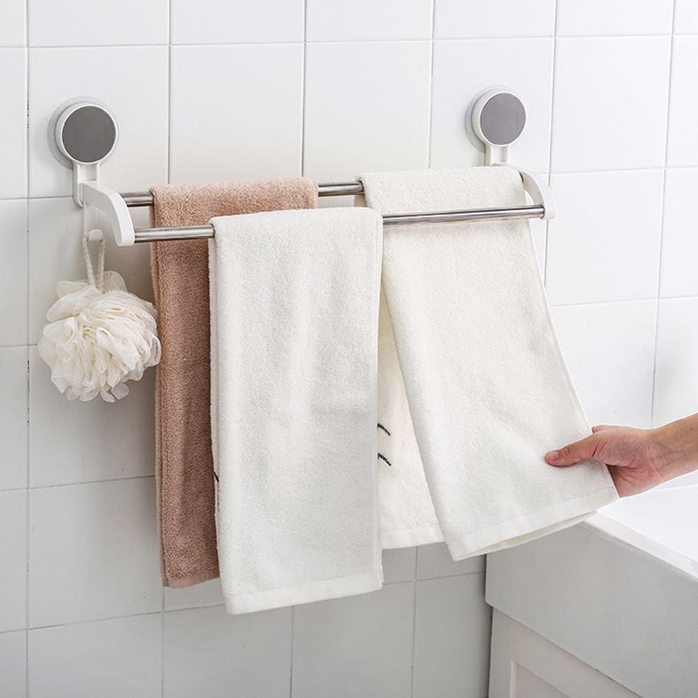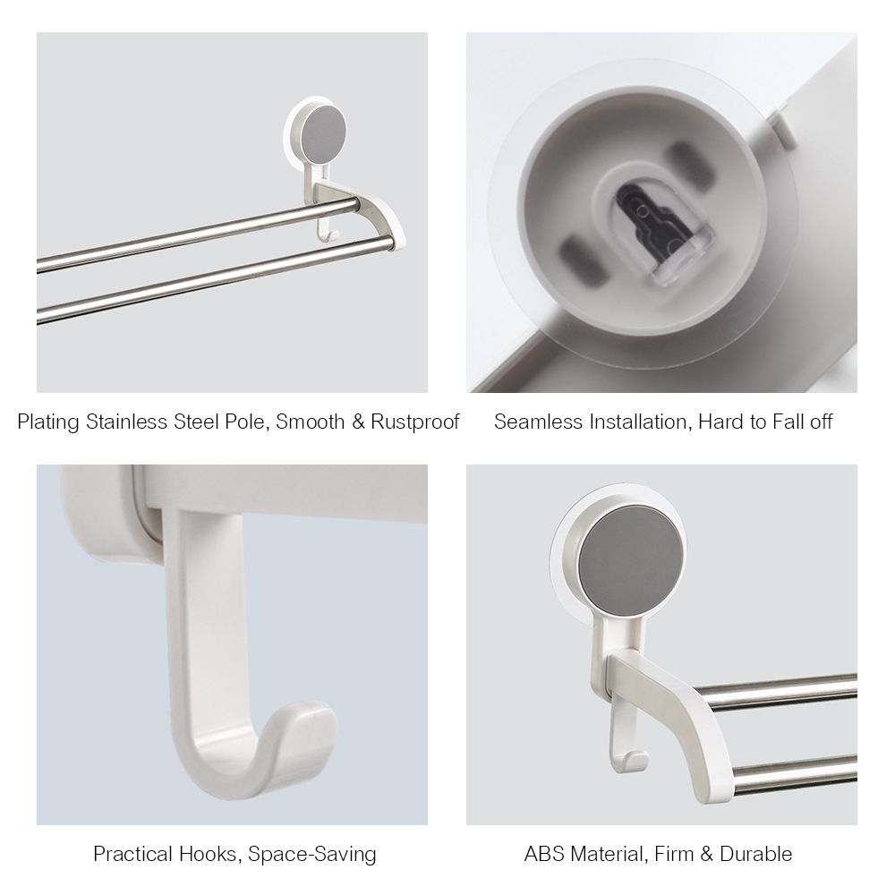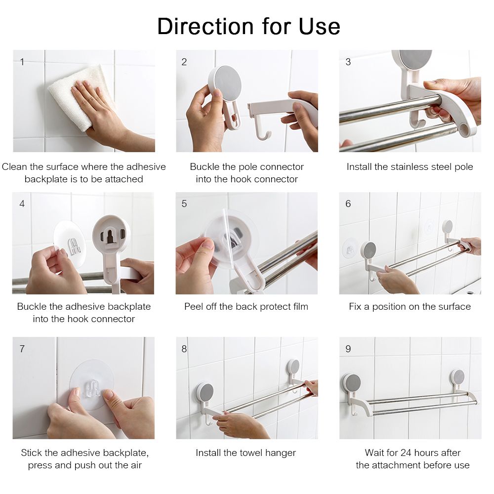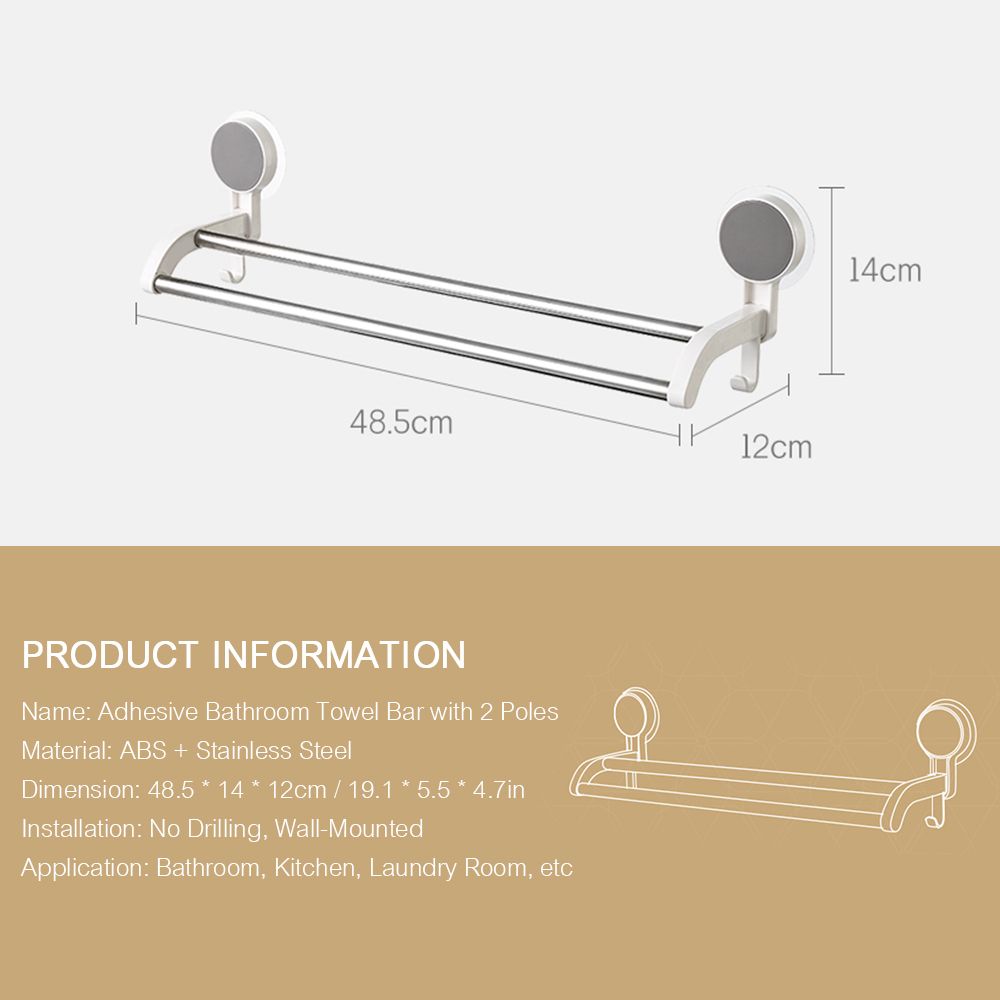 Towel hanger with super sticky backplate, firm and durable to use. Seamless installation, easy to use, practical and space-saving, comes with 2 poles and 2 hooks for hanging bath towels, bath ball, hair dryer and so on., suitable for kitchen, bathroom, laundry room.