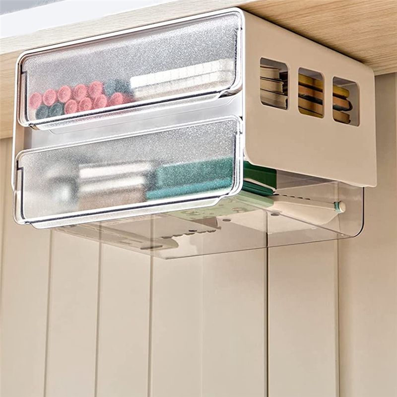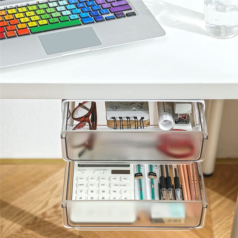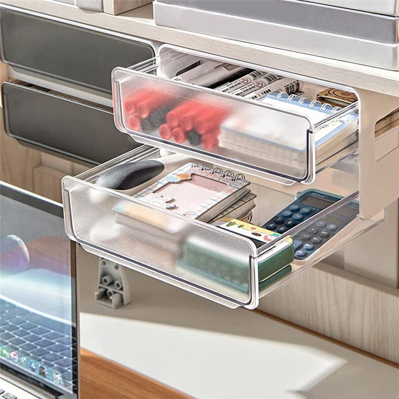 Detailed Information About The Product:STRONG ADHESIVE UNDER DESK STORAGE The drawer under desk can apply to occasions such as office,kitchen, living room, bedroom, study rooms, rooms. Due to the transparent plastic, it's easy to access whatever you need at a . Help to organize your desk and save space. Convenient to clean it as .