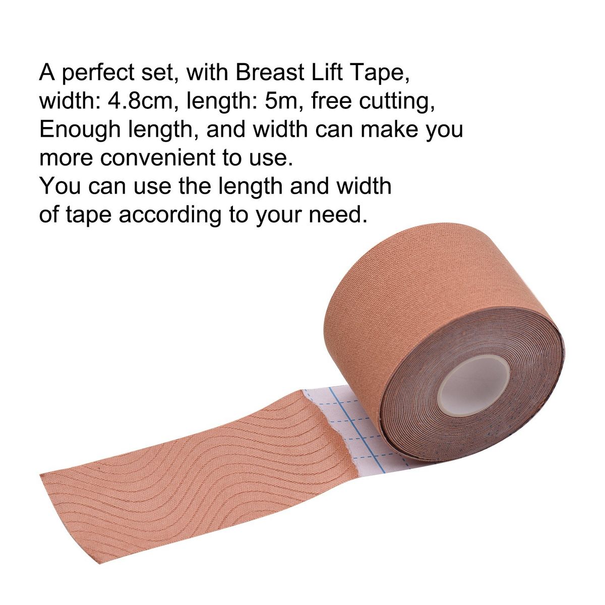 A perfect set, with Breast Lift Tape, width: 4.8cm, length: 5m, free cutting, Enough length, and width can make you more convenient to use. You can use the length and width of tape according to your need.
