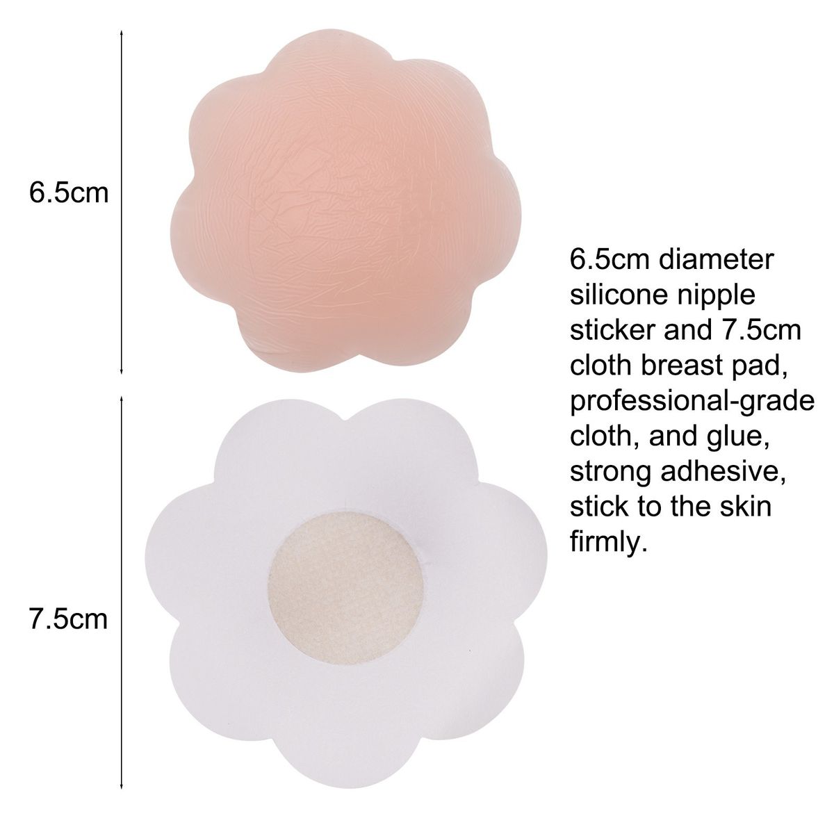 6.5cm diameter silicone nipple sticker and 7.5cm cloth breast pad, professional-grade cloth, and glue, strong adhesive, stick to the skin firmly.