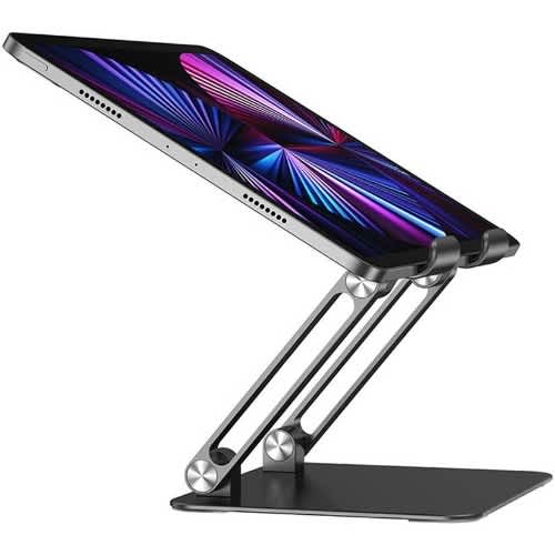 MULTI-ANGLE ADJUSTABLE DESIGN: This stand for laptop and tablet provides 6-speed adjustable height, enables you adjust to comfortable operating angle and height based on your actual need. Ergonomic design for easy watching and typing, relieving neck, shoulder and spinal pain.