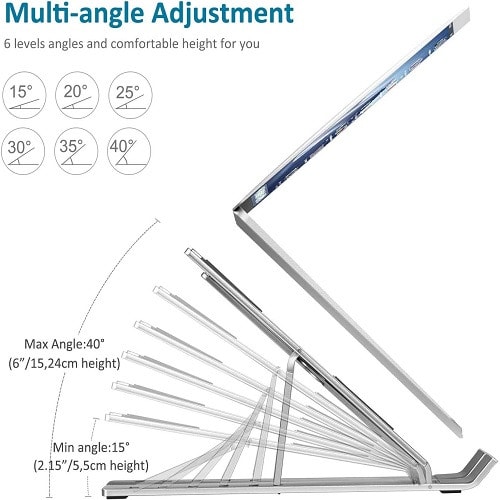 The Innovative Laptop StandSleek adjustable laptop stand made of aluminium alloy with 6 angles of adjustments. Lightweight durable design allows laptop device to breathe away from the surface. It improves air circulation around the laptop device. Multi angle adjustments reduces back aches and tension associated with incorrect sitting posture when using the laptop. The laptop stand provides a better experience for you and better conditions for your laptop. It just makes carrying easy and holds your laptop firm and steady. It's not a desk but bring losts of convenience for your life.