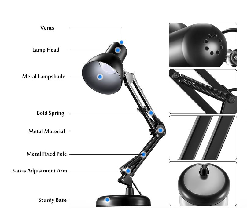 - PREMIUM QUALITY: The lamp stands firmly thanks to the weighted base and the swing arm and lamp shade are made from solid metal with a black finish, making them durable and exquisite to look at. The power plug is UL-listed, making it safe to use