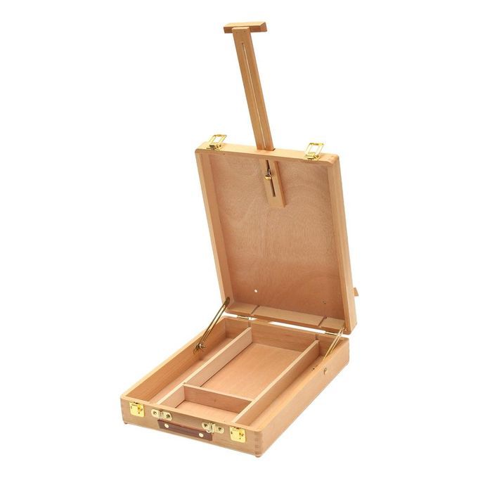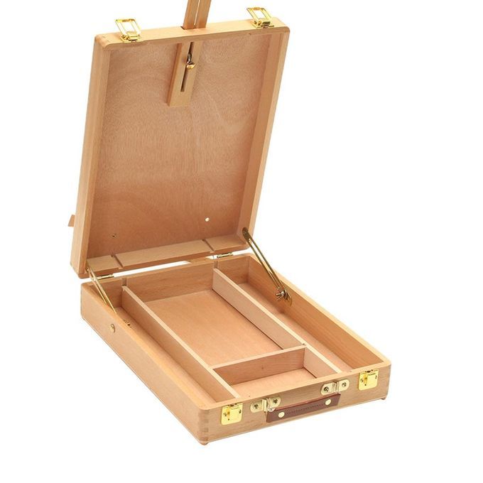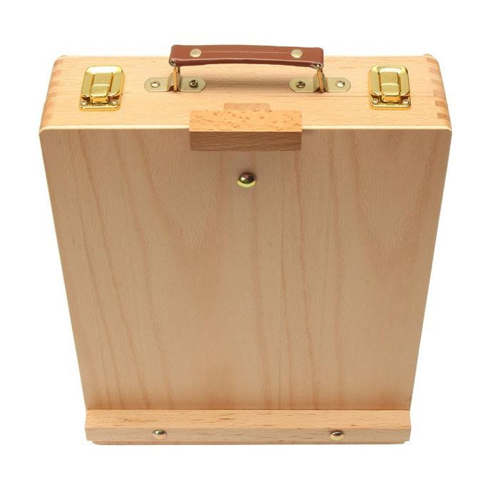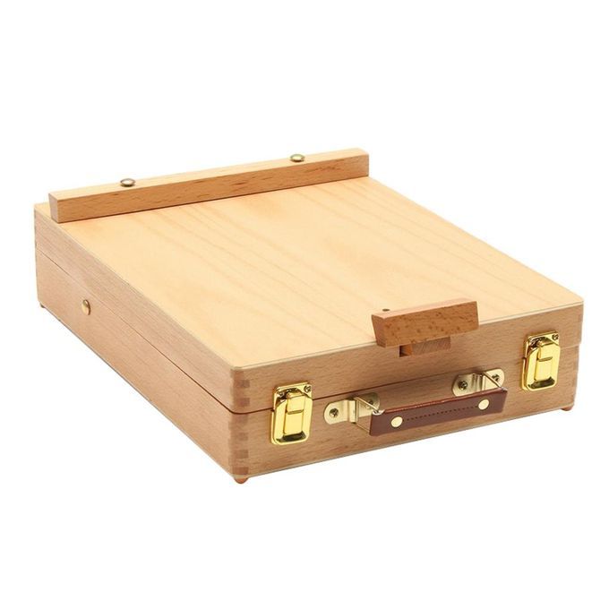 Small French easel style designed sketch box with a storage box that converts into a painting easel. A natural wood colored desktop easel box that's oil finished. Made with hand sanded high quality aged Beechwood.