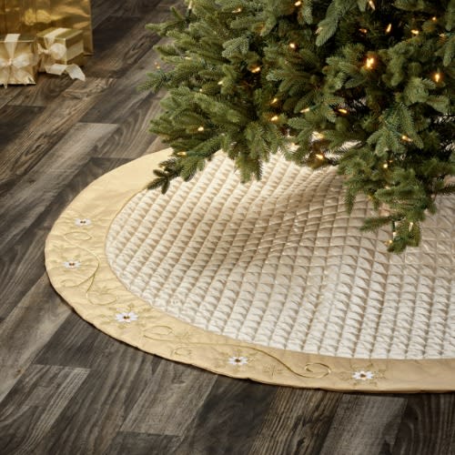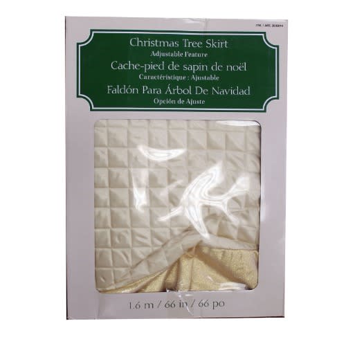 Bring simple elegance to your Christmas tree this year with the Adjustable Luxury Christmas Tree Skirt Gold Skirt with Christmas Tree & Presents.. The unique hexagonal construction of this decorative tree skirt allows adjustments from 66 & rdquo; to 60 & rdquo; to fit larger or smaller trees. This beautiful light gold satin tree skirt features shiny presents with ribbon, applique tree, and rich, deep gold velvet border.Adjusts from 66 inches (1.6m) to 60 inches (1.5m) to fit larger or smaller trees-Elegant light gold satin tree skirt features shiny presents-This tree skirt will add an elegant, yet classic feel to your tree.