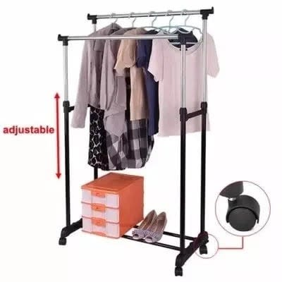 This easy-to-assemble clothing rack has a nice elegant color that fits well in any room, as well as provides easy access and storage of all your garments. In addition to this, the rack features shelves you can use for keeping things like baskets shoes.Our portable garment rack features a double rail rods for easy hanging, helps you keep more clothes as expected and get rid of mess. It is ideal for use in the laundry room, boutique and bedroom among other space.This multifunctional clothes rack with double rail rods, provides much space to organize all of your clothes and keeps them organized & wrinkle-free. This stylish clothes rack is affordable for you, it is constructed from metal iron frame to serve for years and accommodate up to 35kg. With much spaces to keep your clothes clean and tidy. The four caster wheels make it excellent for use on all floor surfaces.This versatile rack provides enough space for all your clothes, which makes it appropriate for both personal and commercial use. Moreover, it can move and lock easily thanks to the four casters ( two of them is lockable). The process of assembling is super easy and fast.
