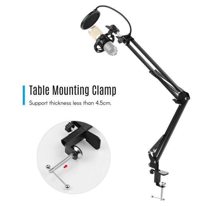Including a table mounting clamp, the microphone stand can be mounted on the table with thickness less than 4.5cm easily.