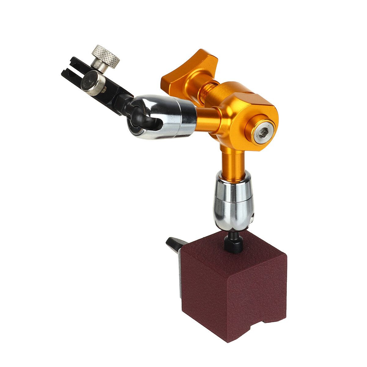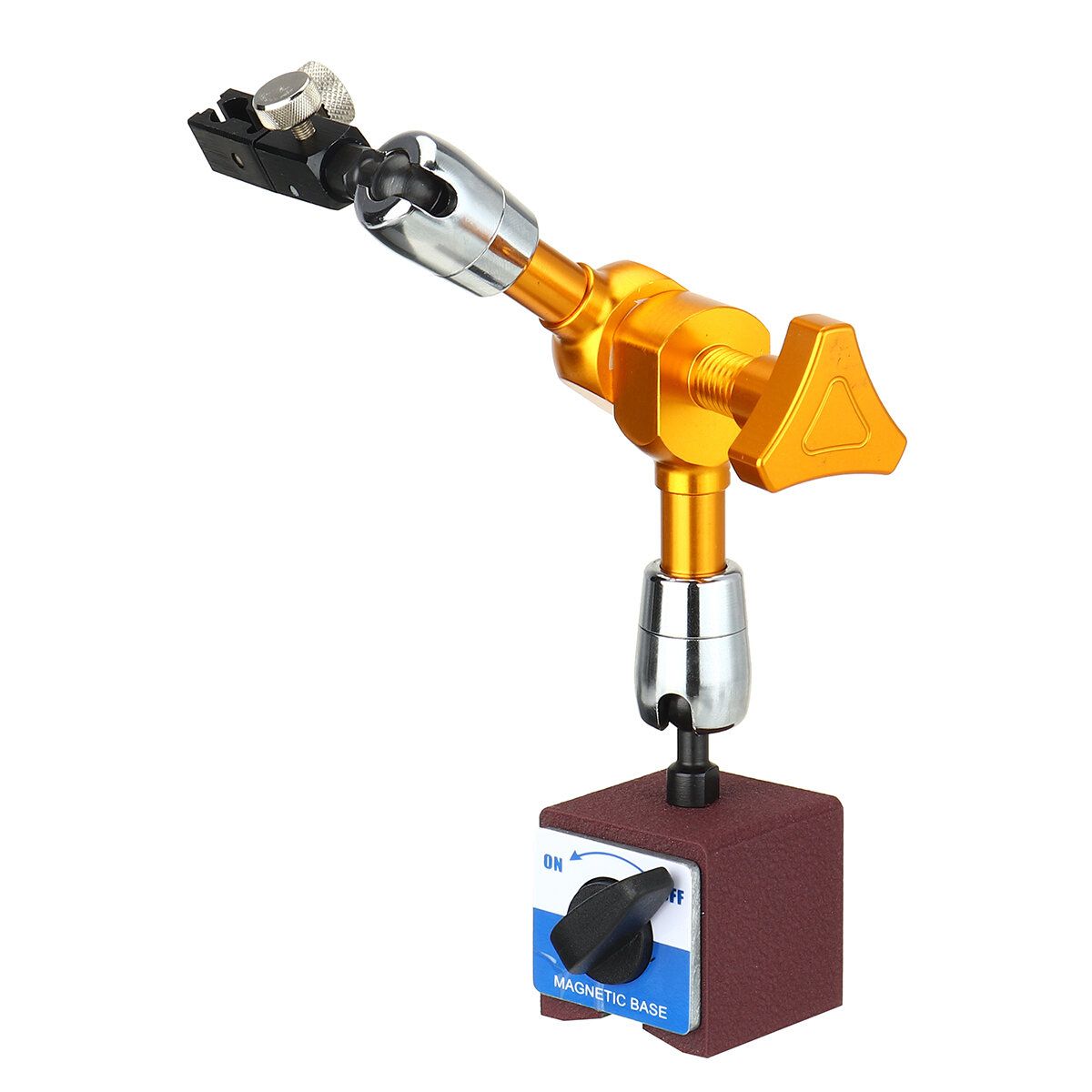 Characteristic amp; Function1.Permanent magnet operation with ON/OFF control.2.V-grooved base for secure mounting on cylindrical surfaces.3.Ideal for holding lever indicators at any orientation on a machine tool for alignment operations.4.Flexible, strong, and precise rotary joints,can adjust any direction and location5.Powerful magnetic base, with on/off switch for magnet6.With high stability, it will be your ideal tool in the measurement of precision workpiece field.7.Designed with three joints8.Easy using for metalwork pieces Specification