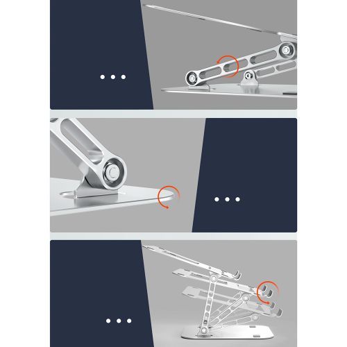 The details you need to know-the foldable structure of this laptop stand can be easily put into your backpack for easy travel and carrying. The raised edges and silicone pad help hold the device in place while protecting your laptop from scratches.