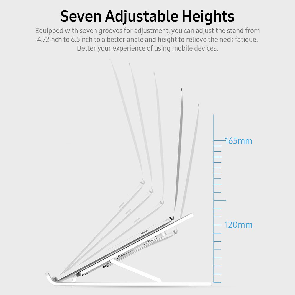 Seven Adjustable Heights. Equipped with seven grooves for adjustment, you can adjust the stand from 3.94inch to 6.3inch to a better angle and height to relieve the neck fatigue. Better your experience of using mobile devices.