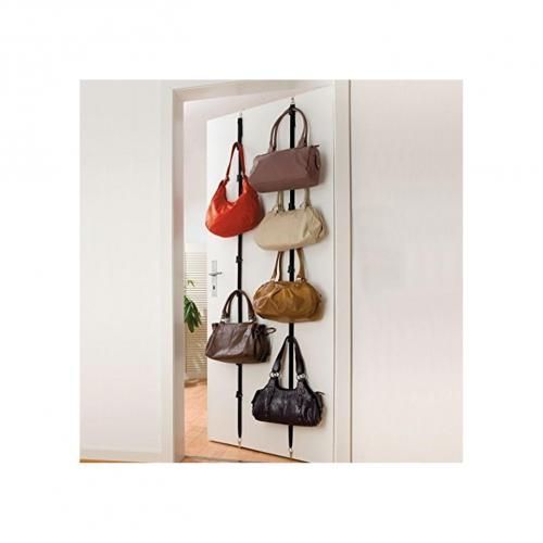 Purse rack hangs on any door or wall2. Simple design features 2 self-adjusing elastic straps with 9 adjustable hanging on each 3. No tools or hardware requied for over-the-door option4. Hardware included for wall-mount option5. Also great for hats,scarves,and more6. The most convenient way to store a wide range of items including purses,clothes,hats,caps,scarves and more.7. Adjustable hooks per strap can be moved and adjusted to fit your spacing needs.The self adjusting elastic strap allows the purse rack to stretch to match door height.8 With both an over the door and wall mounting option,this organizer will fit your specific needs.