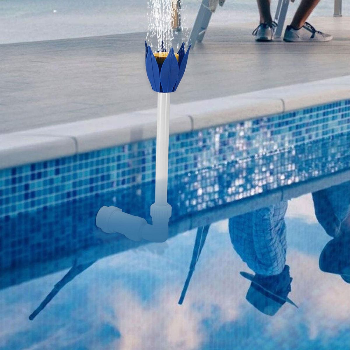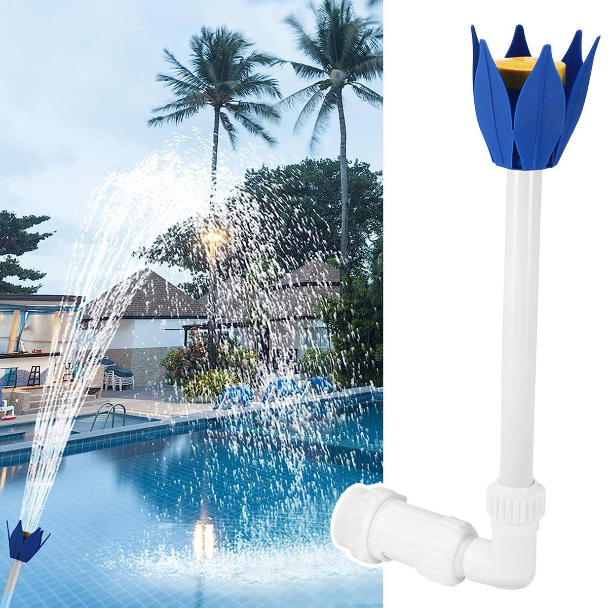The blue flower-shaped sprinkler adds a touch of whimsy and charm to your pool, making it a delightful feature that everyone will love. not only does it create a beautiful cascade of splashes, but it also provides a soothing sound of water that enhances the relaxing atmosphere of your backyard.