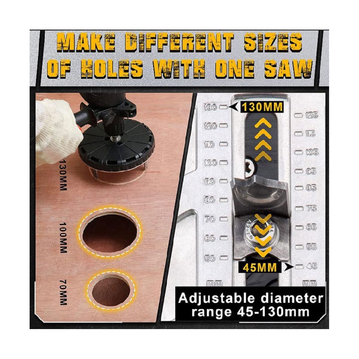 Various Adjustable Diameters: This woodworking hole driller with adjustable multi diameters from 45mm to 130mm, makes it possible to cut holes of different diameters with just one tool, saving money and space.