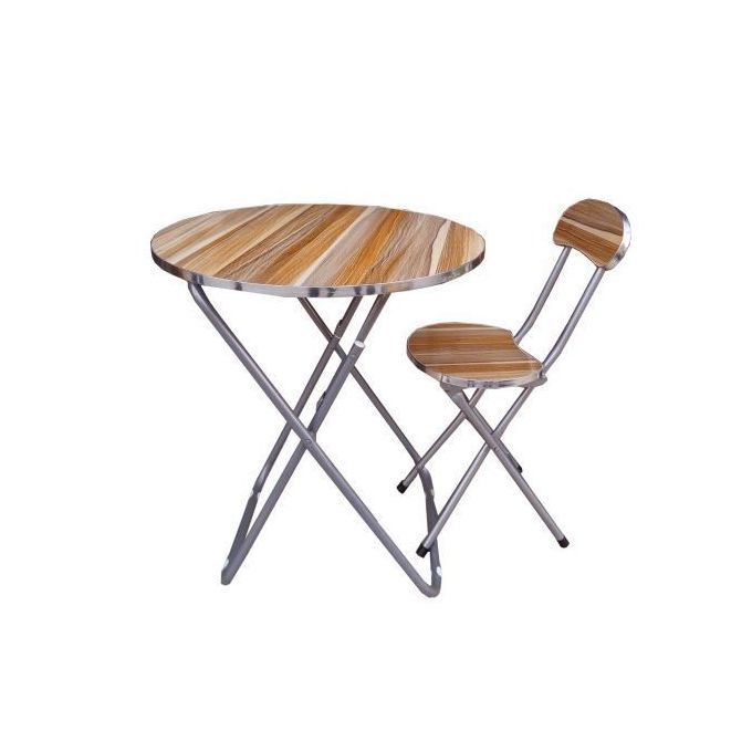 formica/ivory brown wood and well fitted metallic stands that can be adjusted to any height to suit the comfort of the user, both the chair and the table can be folded into a flat and easy to carry shape,