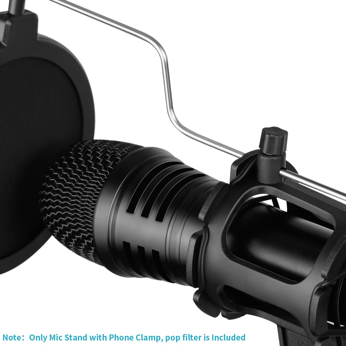 Microphone shock mount for less than 1.2"/36mm Diameter Condenser Mic. The phone holder with flexible gooseneck can be easily adjusted to your needs, can hold the phone under 5.5"/14cm