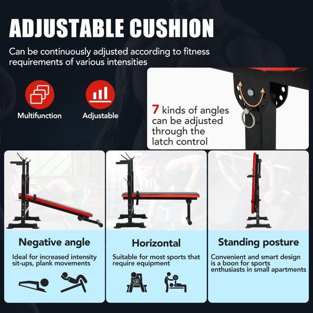 Multifunctional Workout: This workout bench suitable for versatile workouts including bench press and squats, push-ups, abdominal crunch, tricep dip, dumbbell bench, and so on.