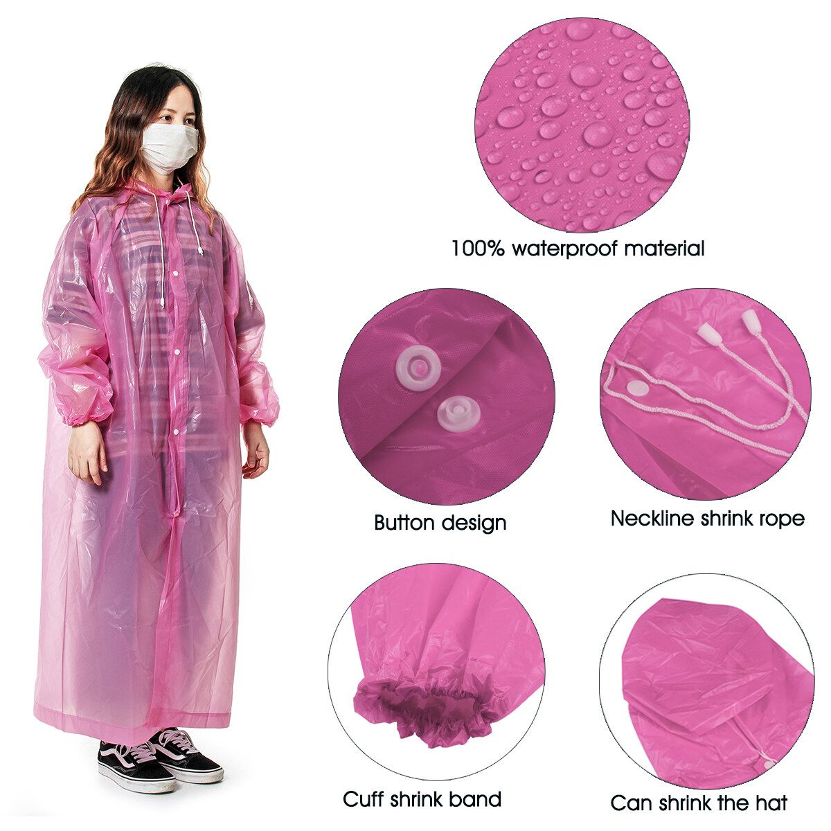 -Drawstring hood and elastic cuffs: prevent water seepage and provide users with adjustment conditions to suit their wear.