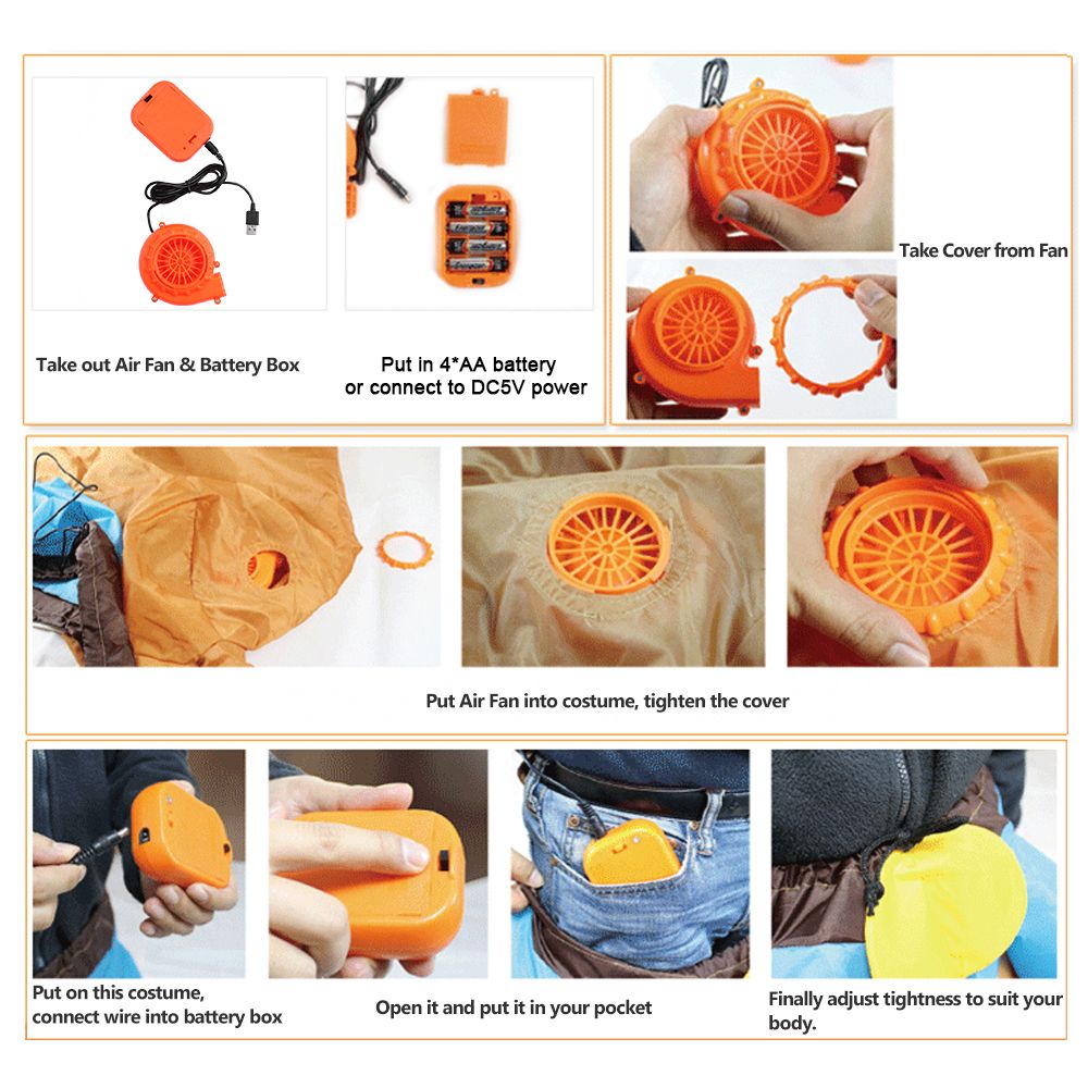 A fan blower, which can be powered by batteries or DC5V, is included to inflate the costume with ease.
