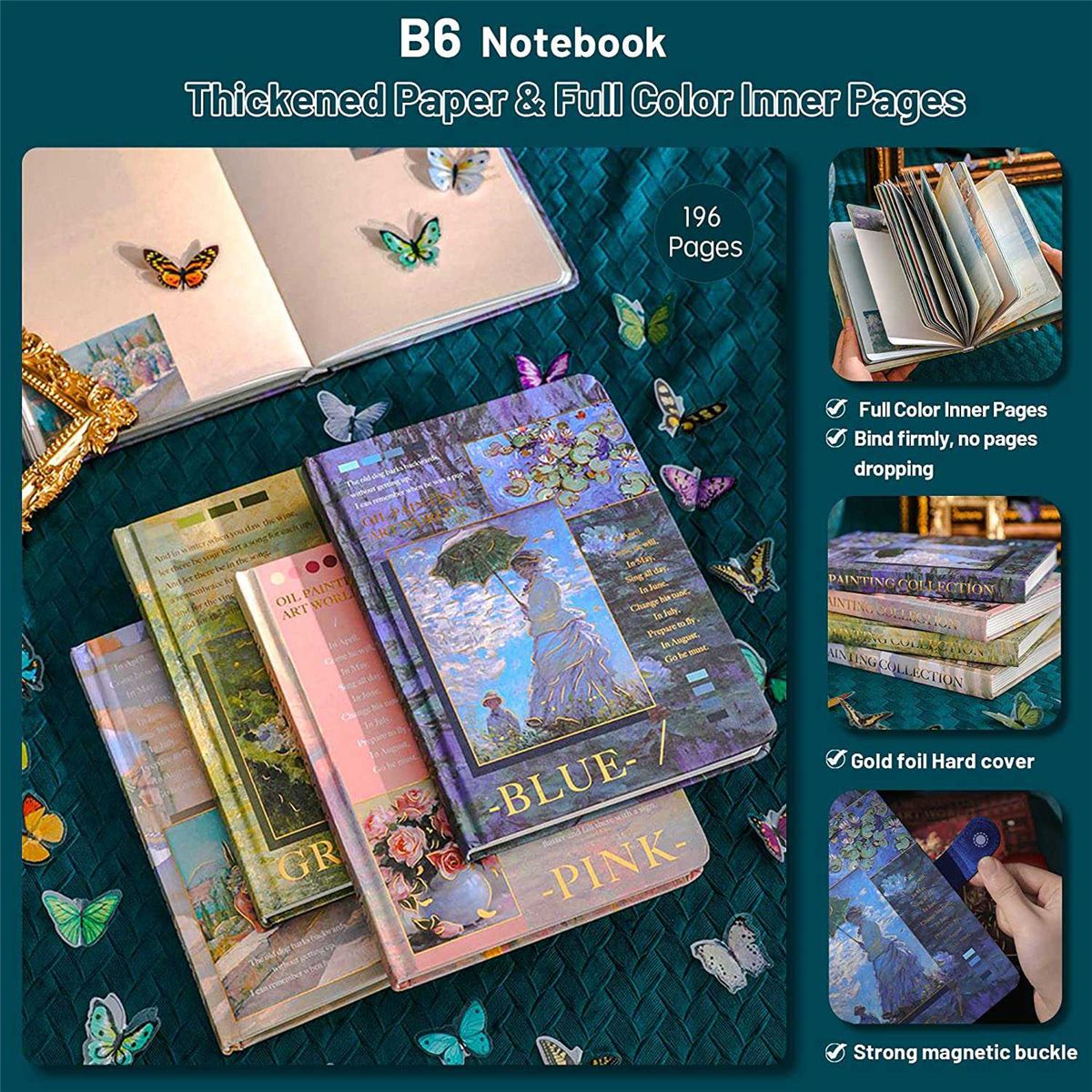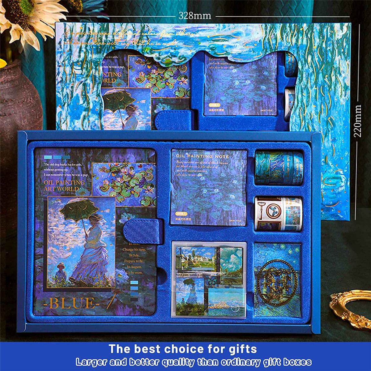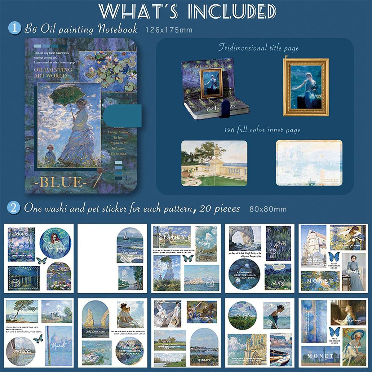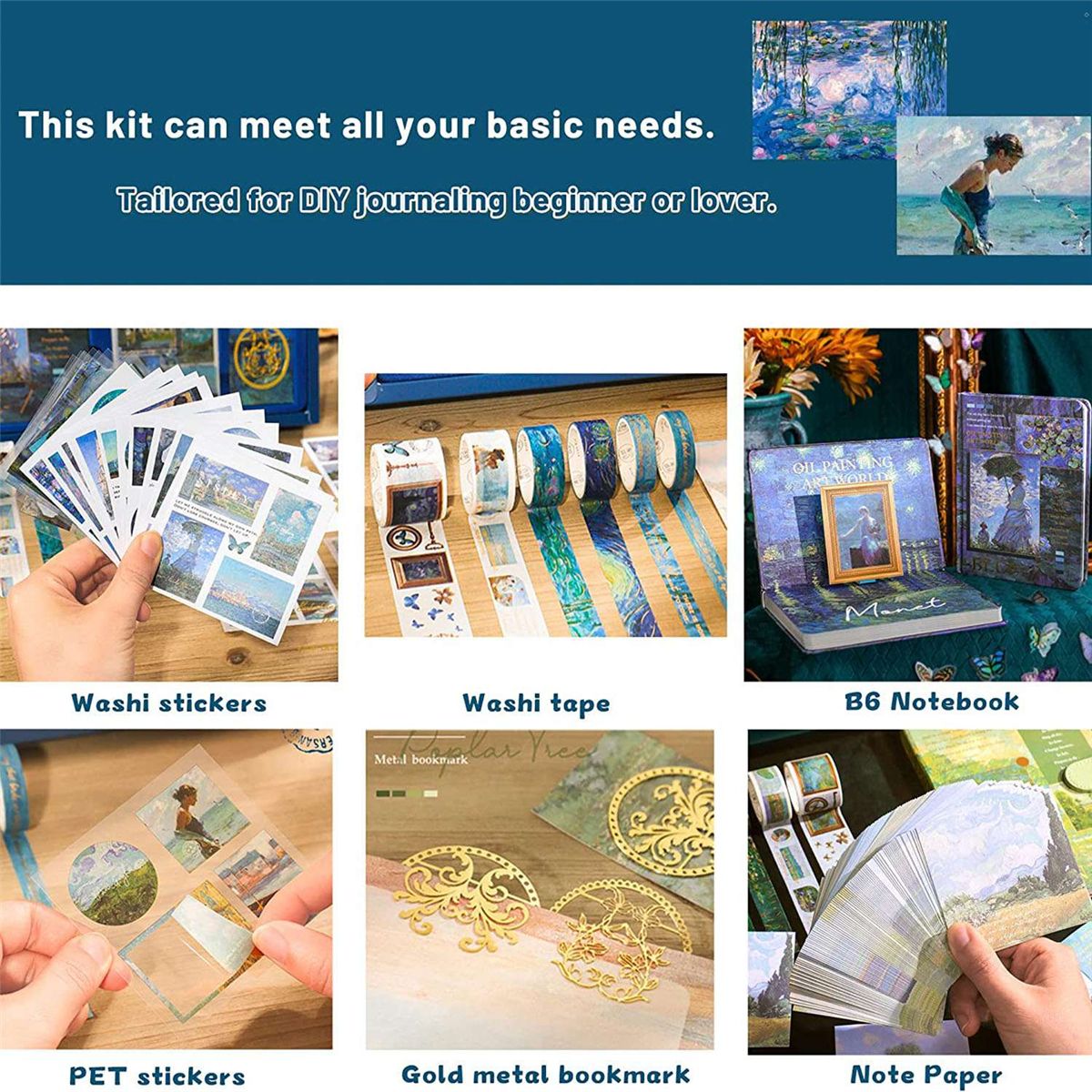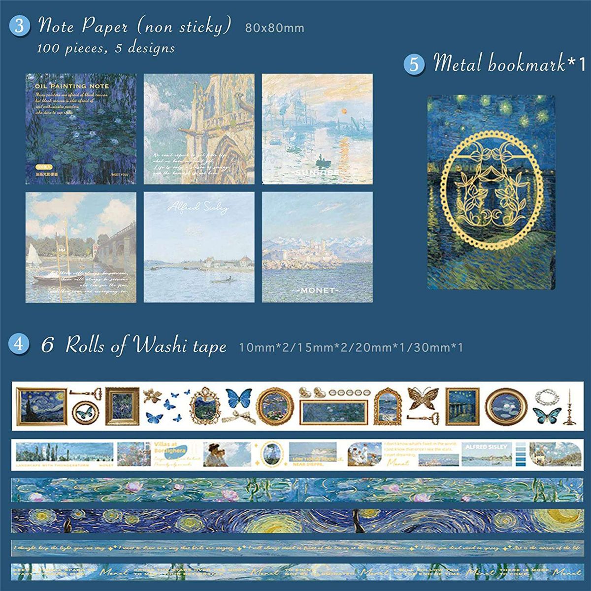 Detailed Information About The Product:Each set includes a gorgeous gift box (13 X 8.7 inches). Includes advanced B6 oil painting aesthetic style notebook, full color inner page, and 3D title page. 20 Washi transparent PET stickers (3.15 X 3.15 inches). 100 non sticky notepads with 5 (3.15 X 3.15 inches). Washi tape: 2 X 10mm+2 X 15mm+1 X 20mm+1 X30mm. A golden metal bookmark. If you are a DIY diary beginner or enthusiast, then this scrapbook product can meet all your basic needs.