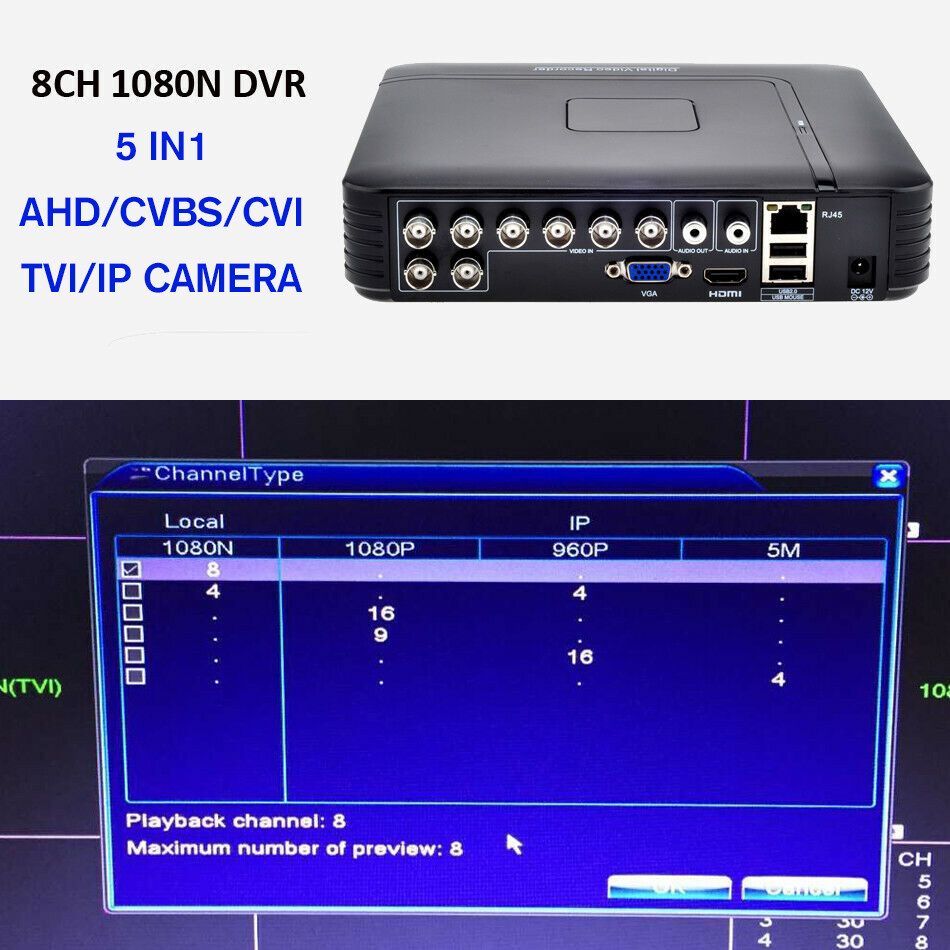Video output: (1ch VGA, 1ch HDMI )for 4ch/ (1ch VGA, 1ch HDMI) for 8ch