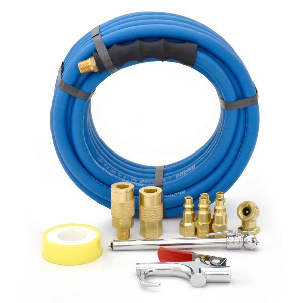 13 piece Kit : BluBird® Air Hose, Safety Blow Gun (1), Tire Gauge(1), Air Chuck (1), Male Plugs Industrial Style 1/4” NPT (3), Female Plugs Industrial Style 1/4” NPT (2), Male Coupler Industrial Style 1/4" NPT (1), Female Coupler Industrial Style 1/4" NPT (1), Teflon Tape (1), Storage Bag (1).