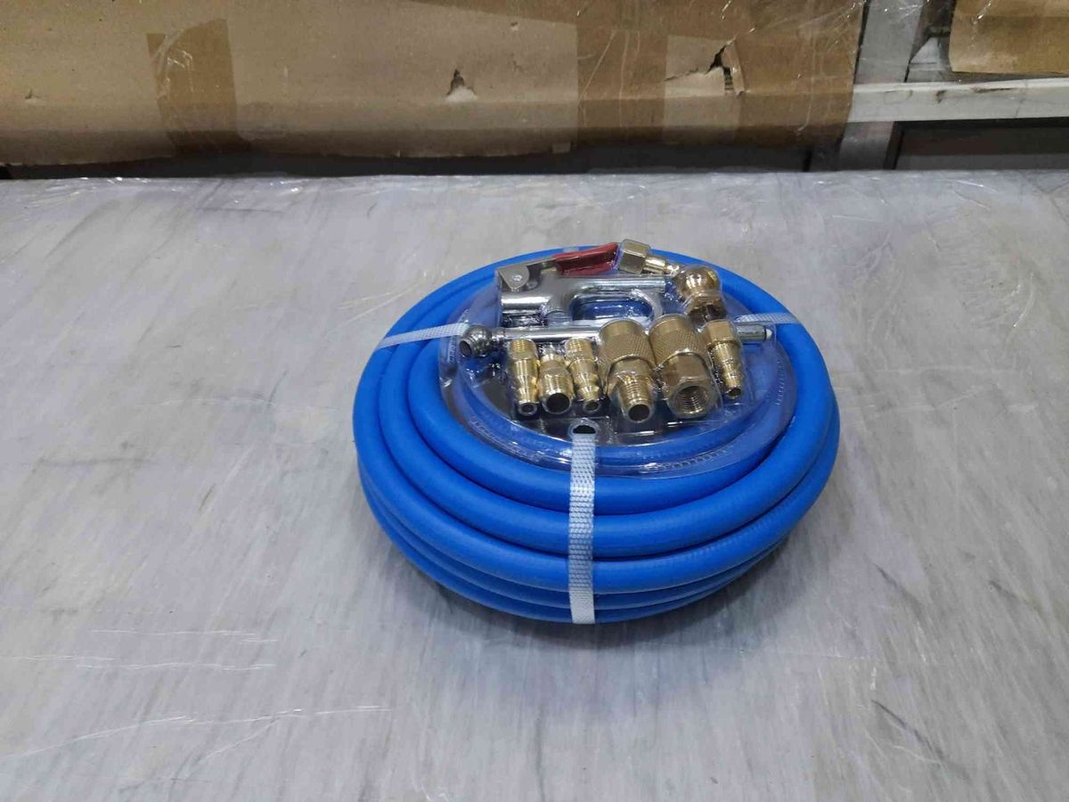 13 piece Kit : BluBird® Air Hose, Safety Blow Gun (1), Tire Gauge(1), Air Chuck (1), Male Plugs Industrial Style 1/4” NPT (3), Female Plugs Industrial Style 1/4” NPT (2), Male Coupler Industrial Style 1/4" NPT (1), Female Coupler Industrial Style 1/4" NPT (1), Teflon Tape (1), Storage Bag (1).