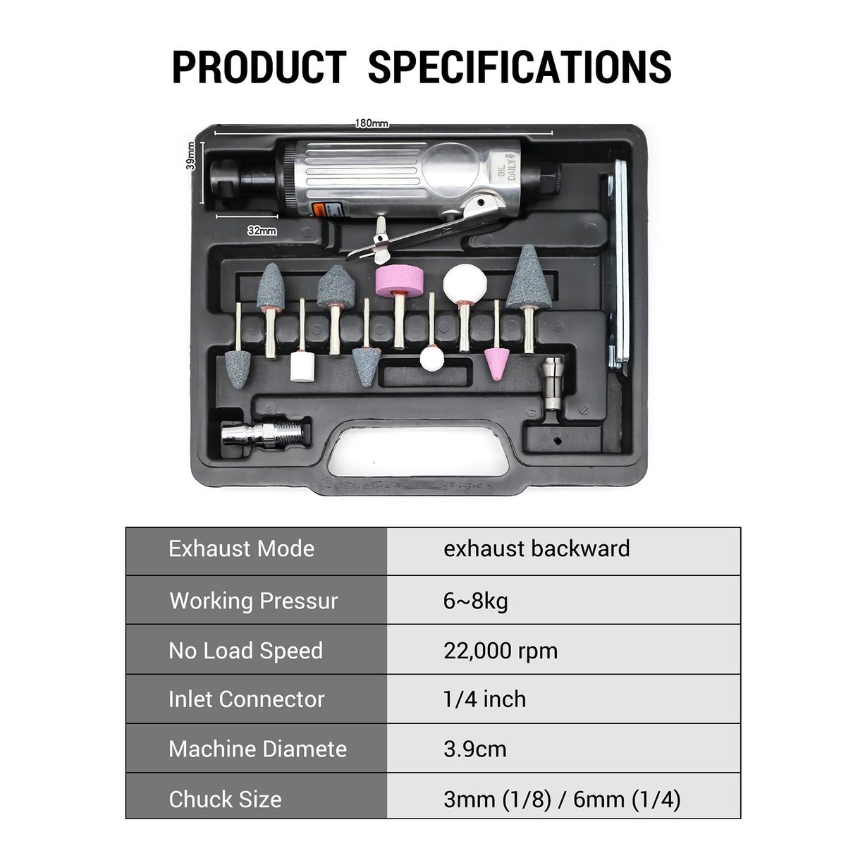 - The air inlet of the grinder is 1/4 inch threaded hole, and the air pump is required to maintain the pressure of 8kg when in use.