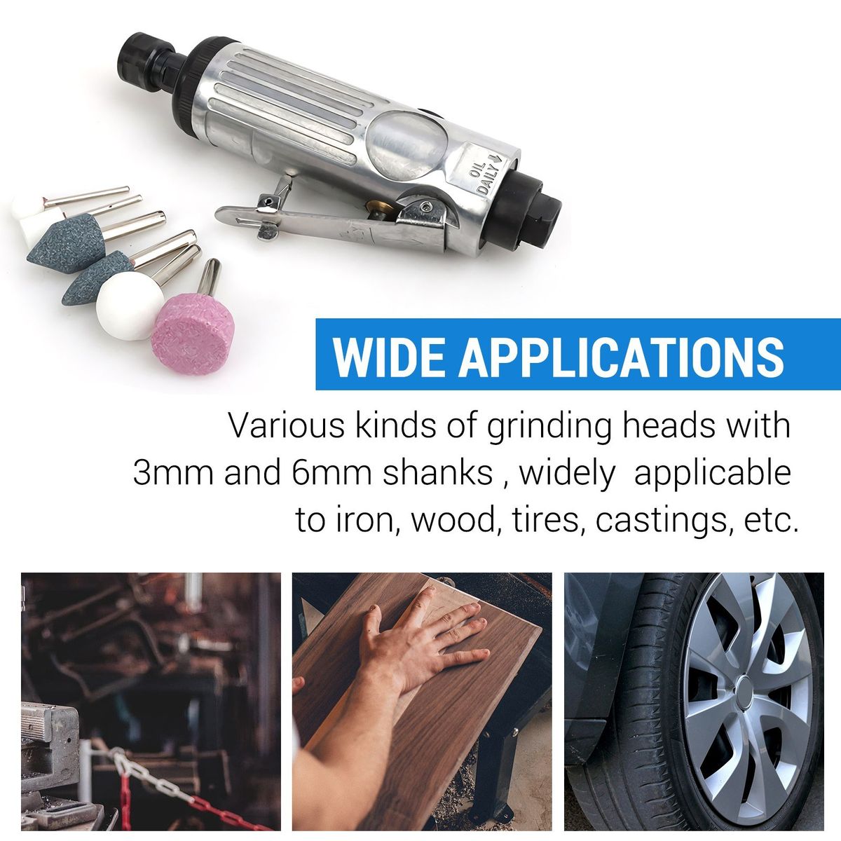 - Various kinds of grinding heads with 3mm and 6mm shanks , widely applicable to iron, wood, tires, castings, etc.