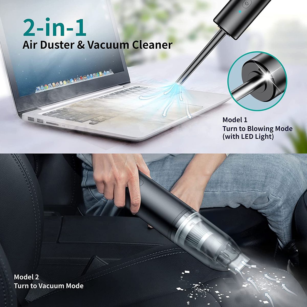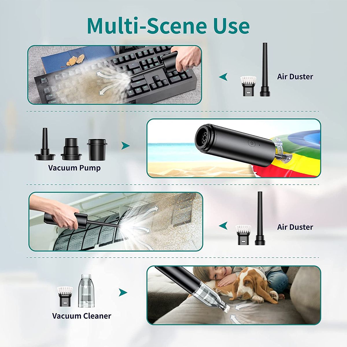 air duster is equipped with an upgraded 70000 RPM high-efficiency motor, with blowing force is up to 1.9-2.5OZ, which provides super airflow for deep cleaning and dust from any electronic device. Long press switch for 3 seconds can switch the device on & off. Short press switch can switch to 2 Gear wind speed ( High Speed: 500L/Mins, Low Speed: 300L/Mins) for different equipment cleaning, so that dust has nowhere to stay.This air blower has a LED light irradiation-point, LED lights automatically illuminate when turned on cordless air duster, allowing you to easily clean up dark corners, bringing great convenience to your cleaning. With its ergonomic shape and cordless design, air duster for computer is small, lightweight, comfortable to hold, and space saving, convenient to carry around.Keyboard cleaner can be recharged and used repeatedly. The computer air duster has a built-in 8000mAh battery, which can run continuously for 20-30 minutes. The car duster comes with a Type-C cord fast charging cable (adapter not included), which can be charged by computer, or mobile power supply. Compressed air dusters battery protection design, Do not charge when the machine just finished using, the battery temperature is too high, please wait 10 minutes to cool down before charging.The rechargeable air duster comes with 4 nozzles, and 2 brushes for multi-scene cleaning, which meets different needs. The thin and long nozzle makes it easier to clean dust from anywhere you want: computers, keyboards, cars, fans, air conditioners, etc electrical and electronic equipment; household cleaning of lily windows, sofa, corner crevices, etc. The multifunctional nozzle is used to inflate swimming rings, yoga balls, air mattresses, beach toys, etc. Use the brush to better clean the dust.