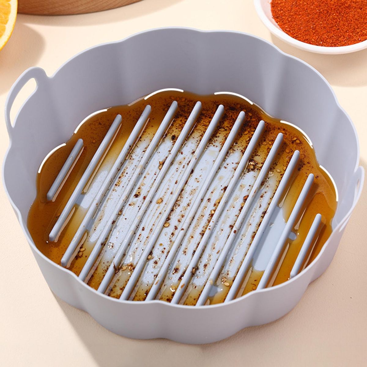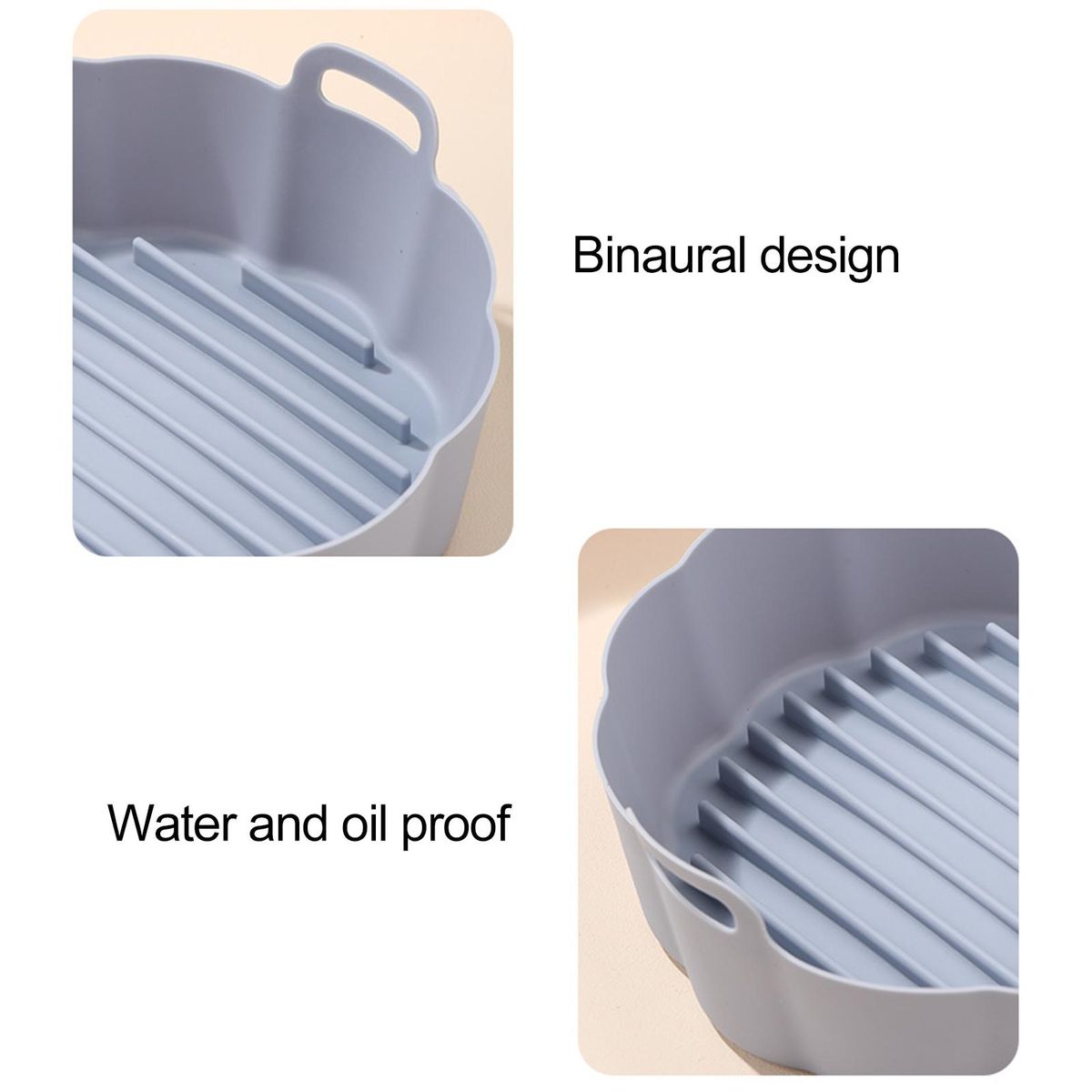 The silicone tray provides evenly heating, double handle, oil draining design, groove design, etc. There are 2 sizes and 5 colors for you to choose from.