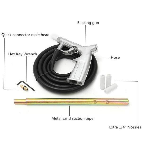 1x Tools 1x Hose 1x Metal sand suction pipe 1x Quick connector male head 1x Key Wrench Designed for Fast Effucient Sand 3x Extra 1/4" Nozzles
