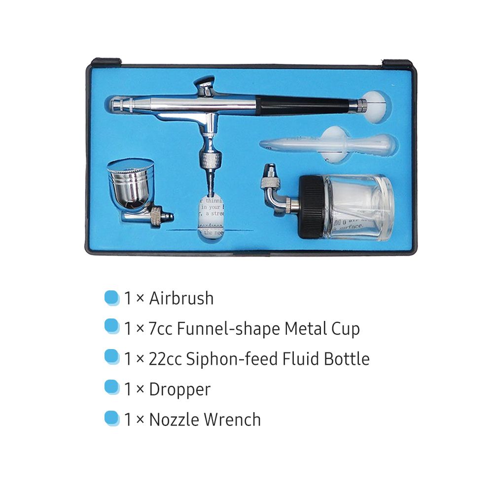 Airbrush, with 22cc siphon feed fluid bottle and 7cc funnel-shape metal cup, meeting different demands.
