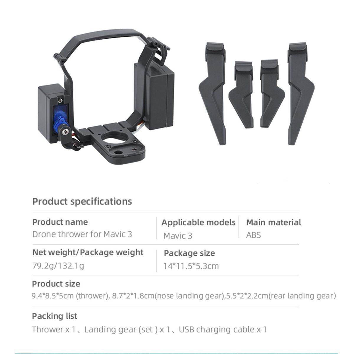 Features: The height of the front landing gear is increased by 3.7cm, and the height of the rear landing gear is increased by 3cm, can effectively prevent ground debris from contaminating the body or damaging the gimbal and body during take-off and landingLightweight And Safe: It will neither add burden on your nor damage it.Easy To Throw: USB charging, quick releaseFitment: Suitable for 3 Wide Use: Can be remotely delivered, for advertising, throw bait, throw gifts, delivery meals, delivery wedding rings, etc.