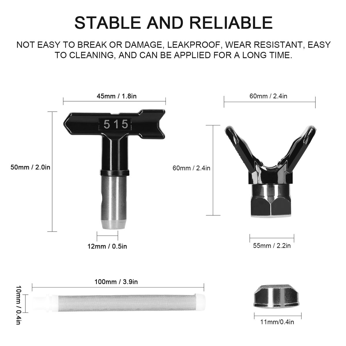 A set of 6 types of nozzles, corresponding to different spraying ranges, meet a variety of needs, and are suitable for most types of airless spraying machines, also equipped with five spraying machine filters to prevents machine blockage.
