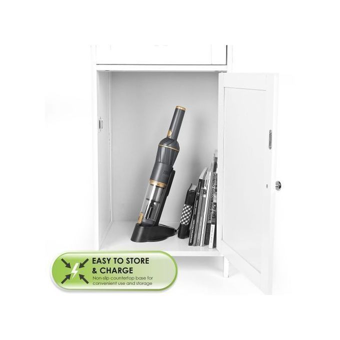 Measuring 40 x 7 x 7 cm with a lightweight and compact design, the vacuum includes a convenient countertop storage and charging base.