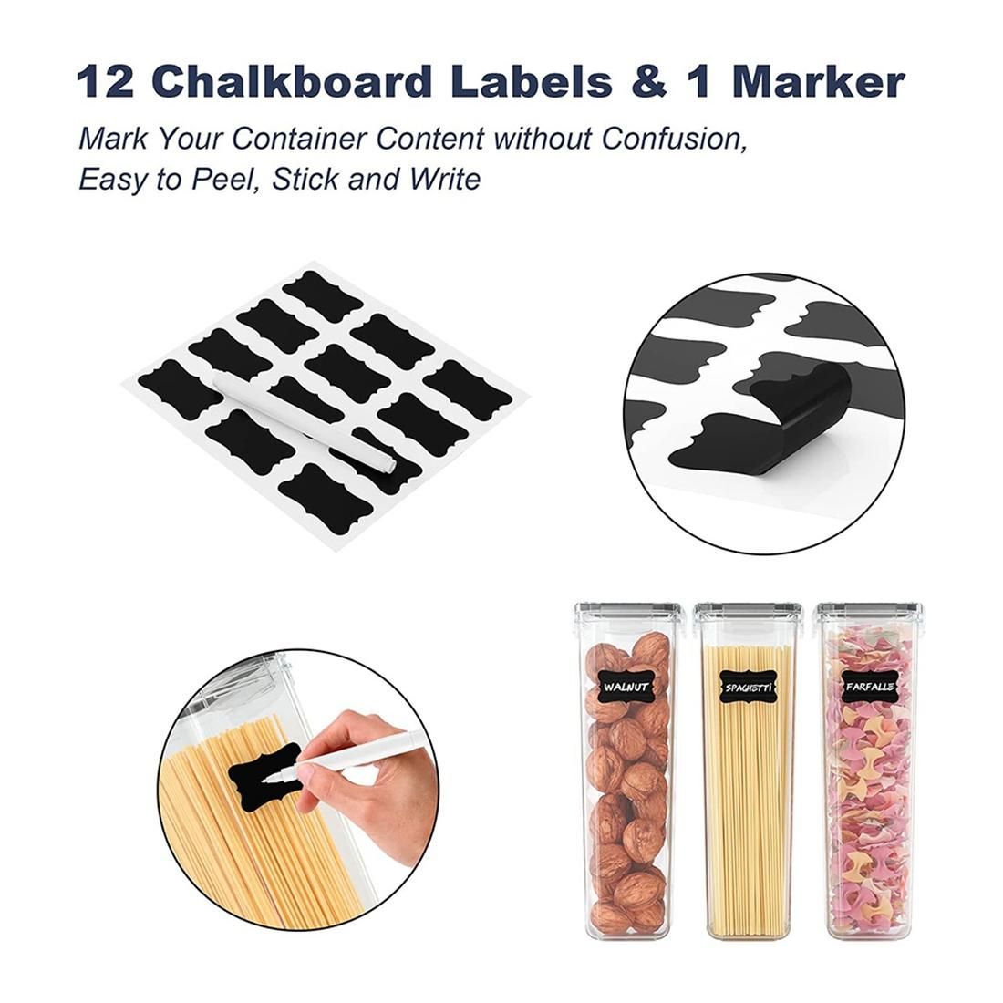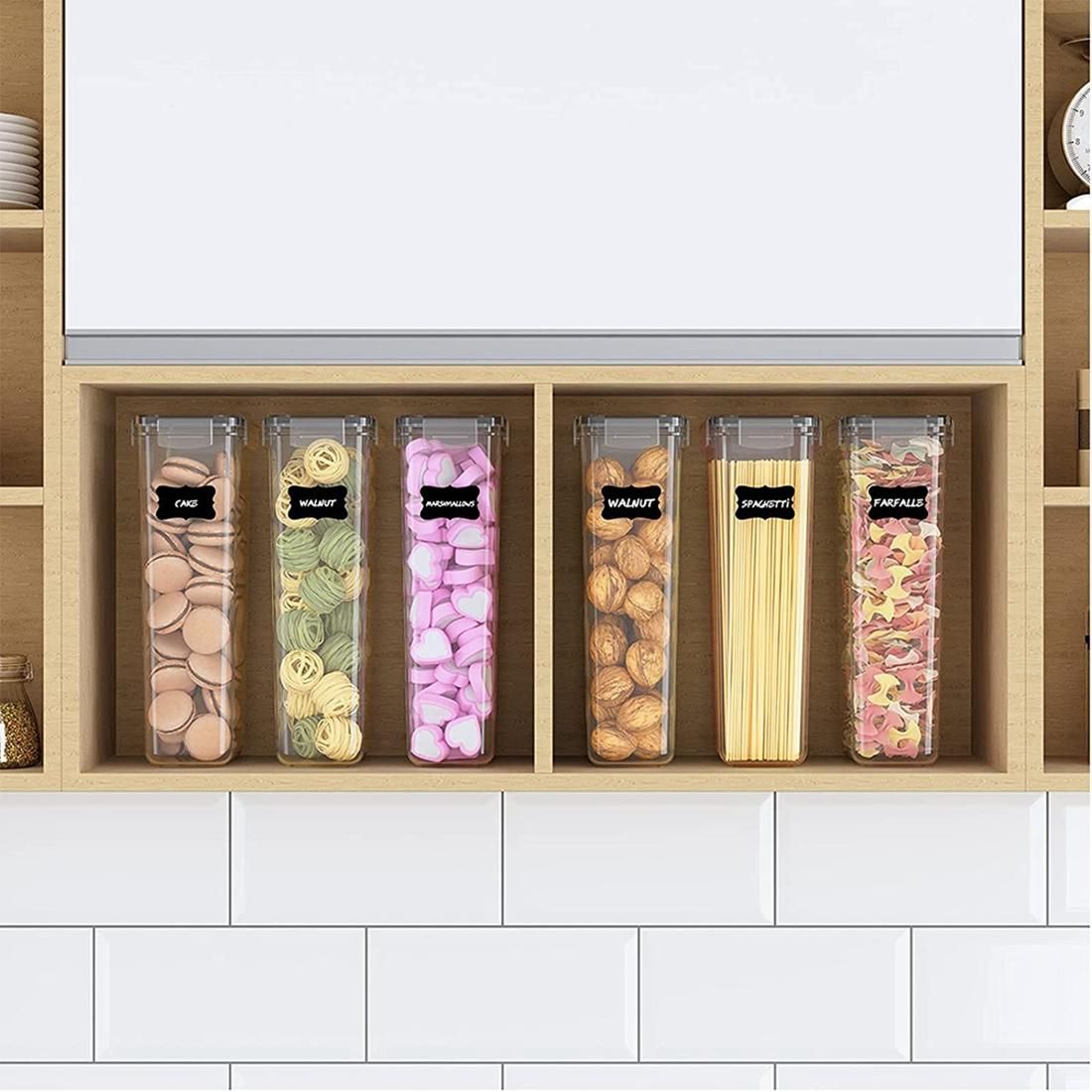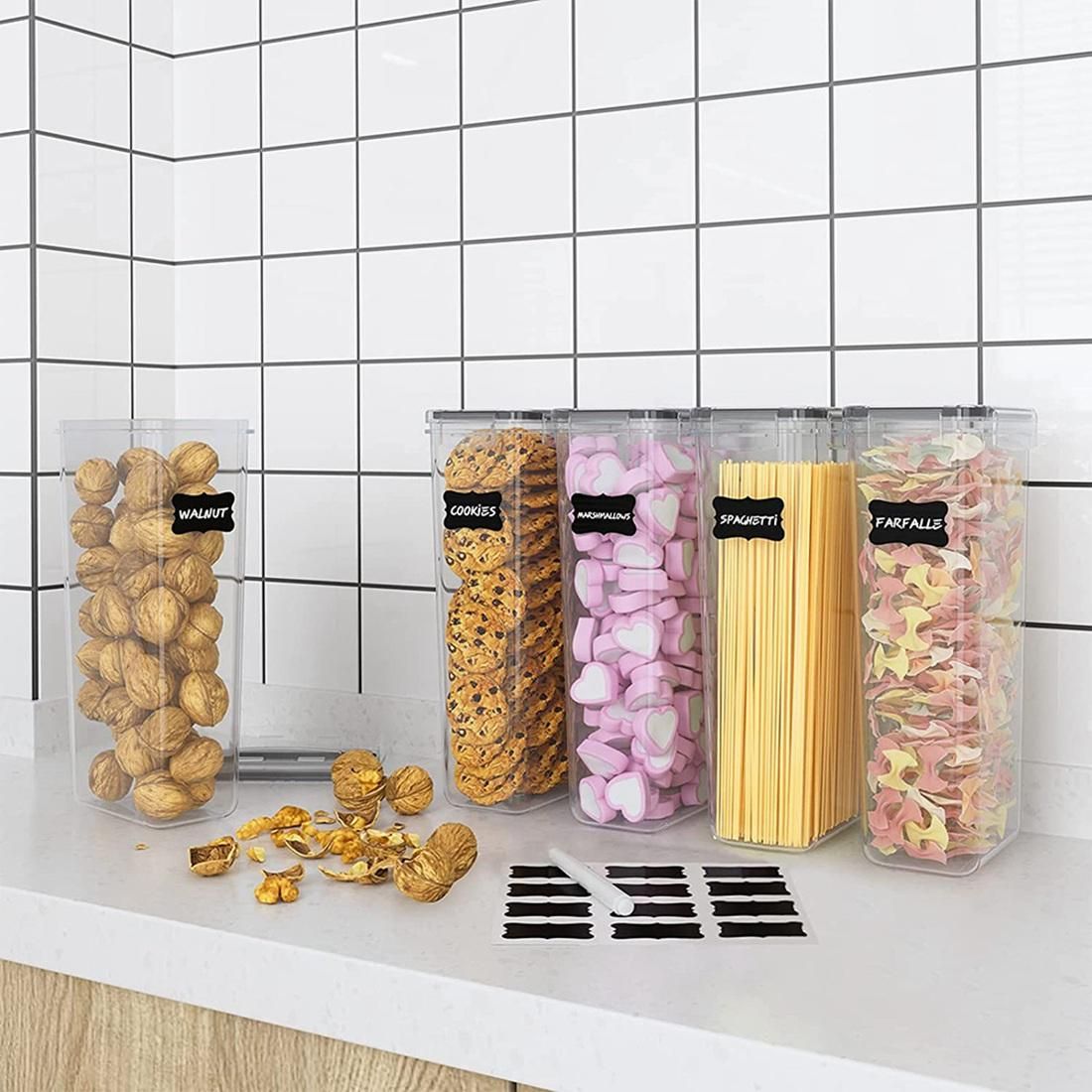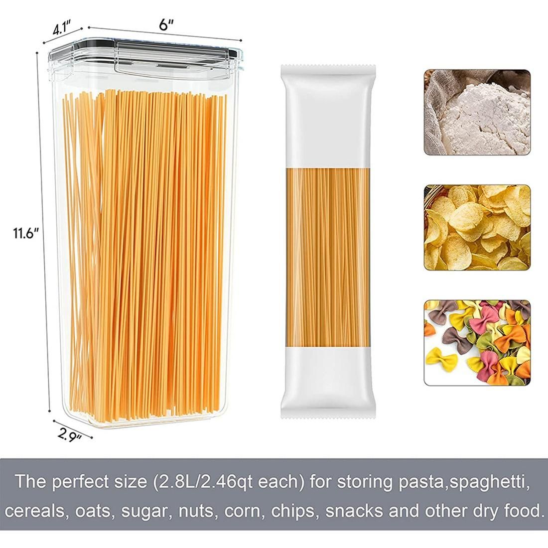 MULTI USE - Our airtight food storage containers are suitable for spaghetti, pasta, flour, sugar, baking supplies, cereal, oats, coffee, tea, snacks, nuts and other dry goods. With stackable design, these plastic storage containers will easily fit into your refrigerator, freezer or cupboard which enables you to get the kitchen organized and frees up space in the pantry.