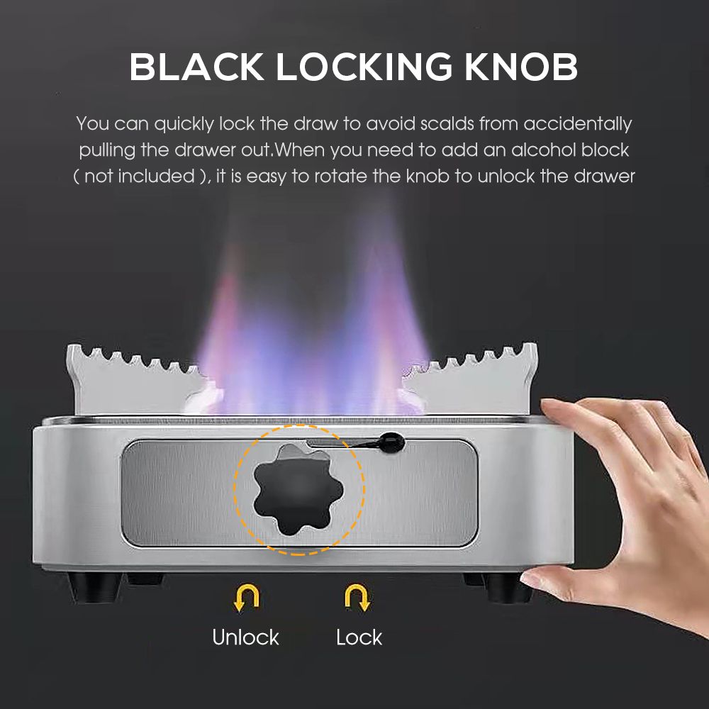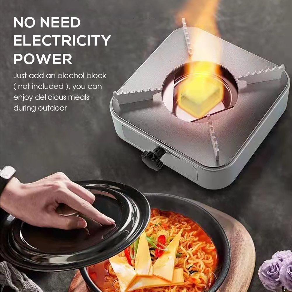 No need electricity , just add an alcohol block (not included) to enjoy delicious meals during outdoor.