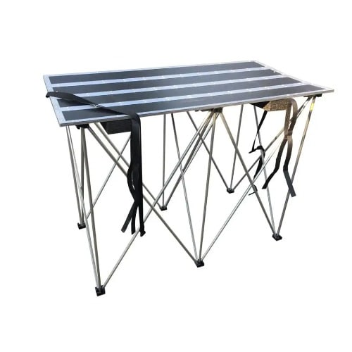 Introducing a smart new accessory every musician needs. The RRSTANDT is a revolutionary new concept in portable tables. Deceptively light and sturdy, the RRSTANDT is constructed out of 3/8 & Prime; plywood and is supported by a lockable, lightweight collapsible riser. When not in use, the risers stow away neatly inside the rolled up table top and the whole product can then be easily carried on your shoulder with the included shoulder strap. No more lugging around heavy tables! Table top measures 48 & Prime; long x 24 & Prime; wide. Supports up to 2,200LBS (1000kg)
