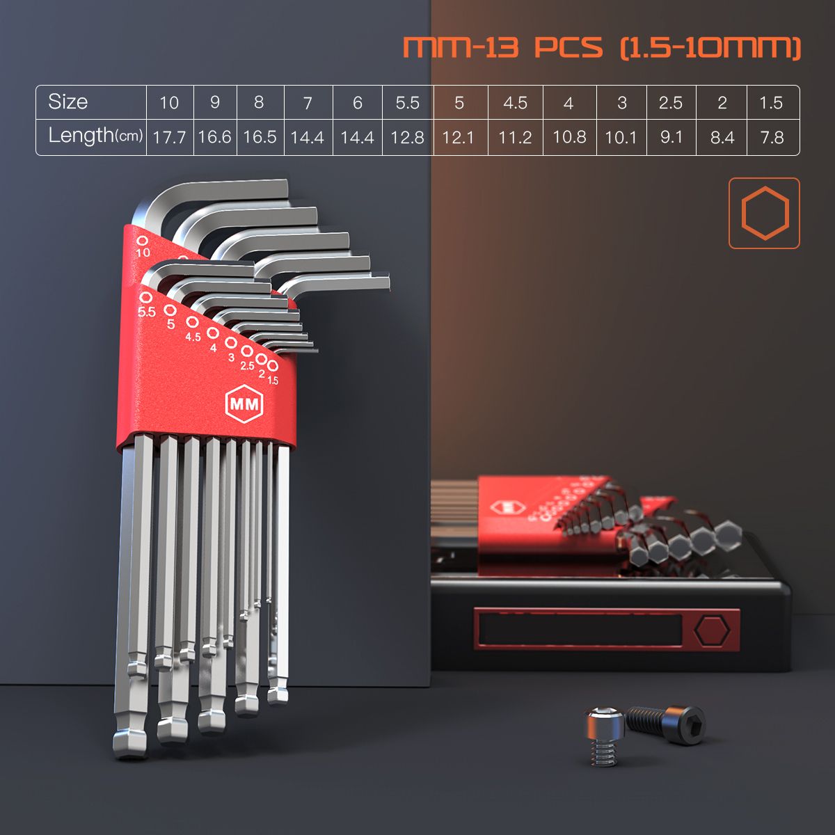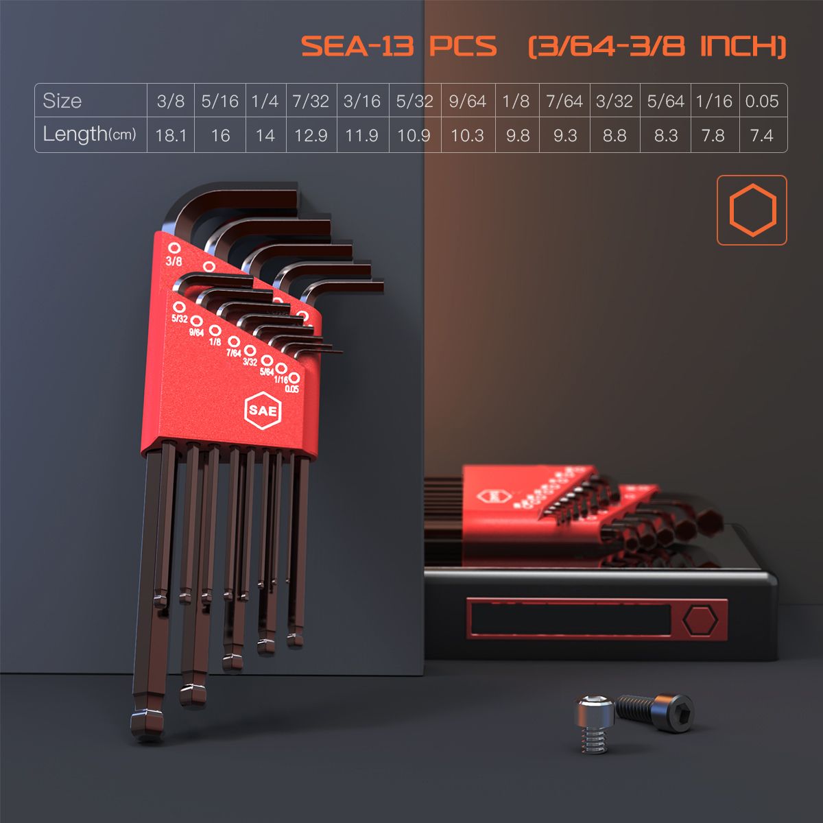 Quantity:35 Pieces(13pcs SAE hex key, 13pcs metric hex key, 9pcs torx key set)
