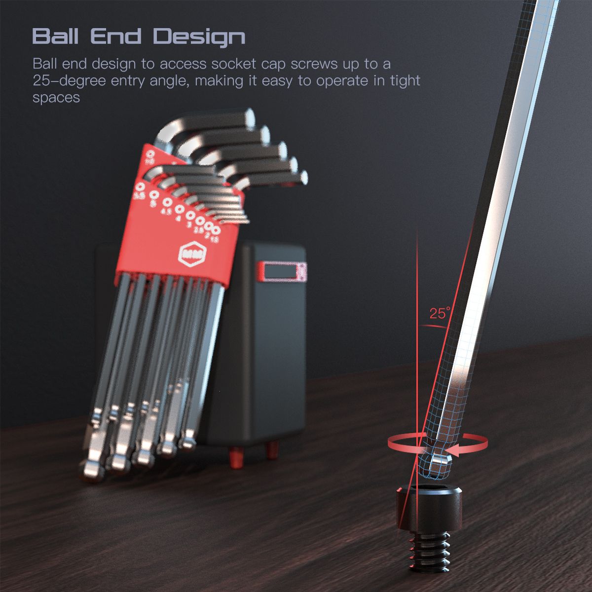 【Ball End Design】Ball end design to access socket cap screws up to a 25-degree entry angle for providing greater torque, extra reach, and easy access