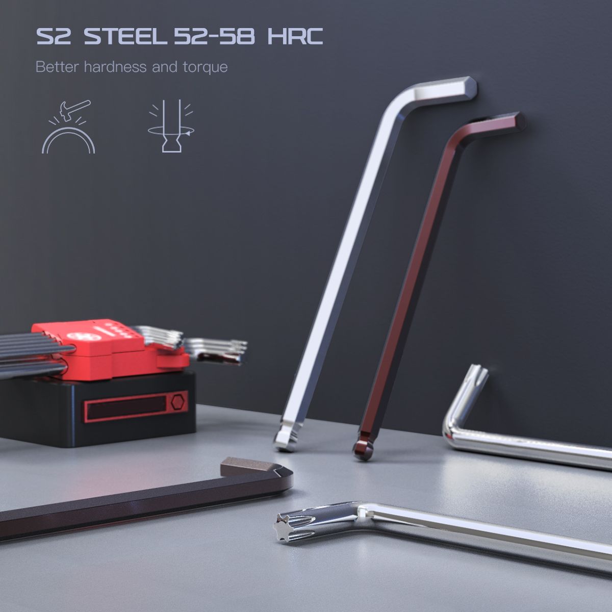 【S2 Steel Hardeness】Made of S2 Steel and CRV (Red wrenchs are S2), it\'s hardness can reach to 52-58 HRC for ultimate strength and reliable performance better hardness than normal chrome vanadium steel (CRV)
