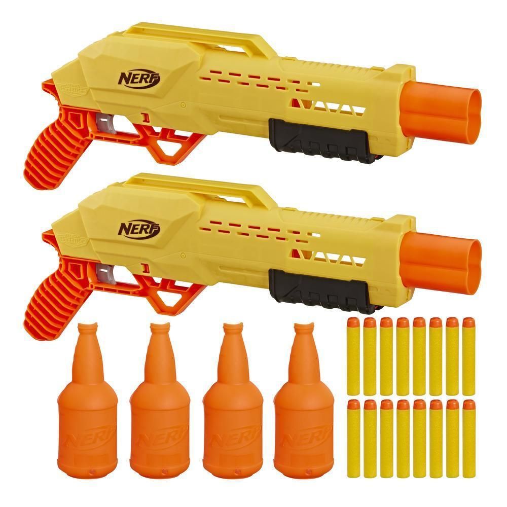 The 22-piece Tiger DB-2 Duel Targeting Set includes 2 Tiger DB-2 blasters that fire 2 darts in a row for double-barrel blasting! Also includes 16 Official Nerf Elite darts and 4 half-targets that can be attached to create 2 whole targets. Load 2 darts, pump the priming handle, and pull the trigger to fire 1 dart. Prime and pull again to fire the second dart. Official Nerf darts are tested and approved for performance and quality and constructed of foam with flexible, hollow tips. No batteries required.