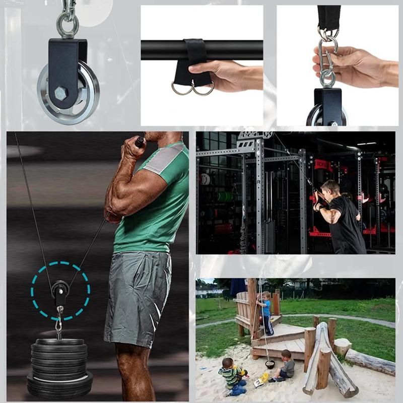 The pulley wheel with a rotatable ring on the top, which is connected to the part of home gym system, can rotate freely at 360 degrees. The cable pulley can prevent the rope/cable/steel rope from knotting, which is safer and more practical than traditional pulleys. The smooth roller is widely used in tractive effort of steel wire rope or other rope tools.