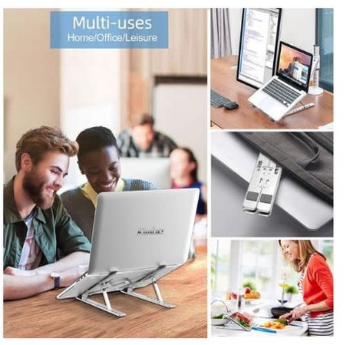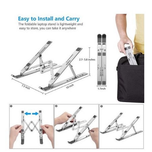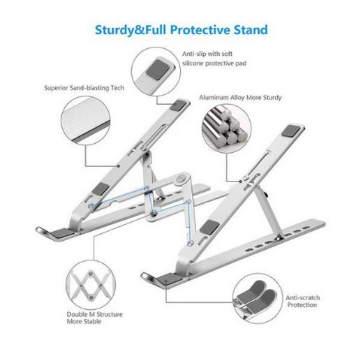 The Innovative Laptop StandSleek adjustable laptop stand made of aluminium alloy with 6 angles of adjustments. Lightweight durable design allows laptop device to breathe away from the surface. It improves air circulation around the laptop device. Multi angle adjustments reduces back aches and tension associated with incorrect sitting posture when using the laptop. The laptop stand provides a better experience for you and better conditions for your laptop. It just makes carrying easy and holds your laptop firm and steady. It's not a desk but bring losts of convenience for your life.