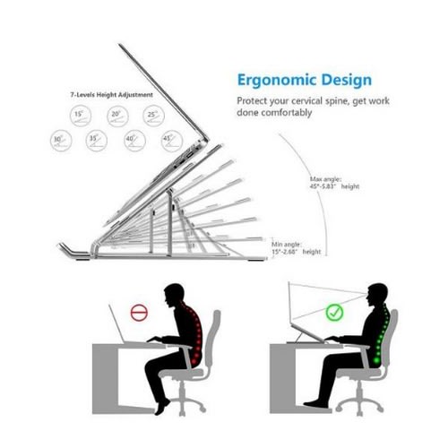 Ergonomic- Unique designed Stand for laptop support are specially calibrated to raise your laptop 6 inches off your work surface with a 15 & deg; forward tilt, to achieve the ideal eye-level height for optimum posture and comfort. Adjusting an ideal height for typing, watching, and sitting properly while supporting your back and neck with a comfortable posture. Very comfortable for working in home, office and outdoor