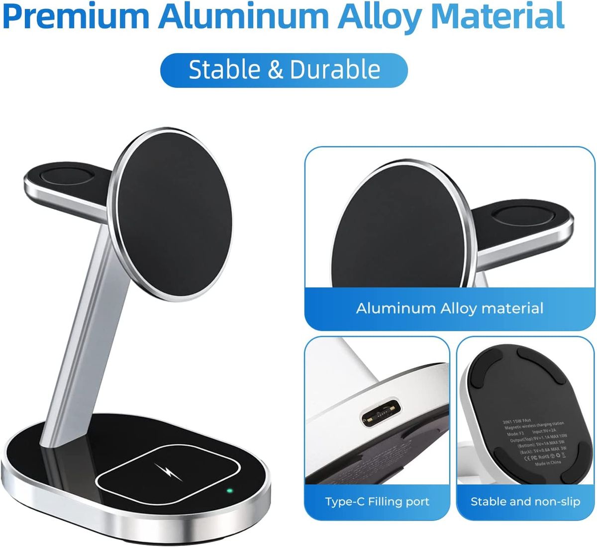 - 【三合一无线充电站】-无线充电座由优质铝制造,CNC制造工艺,坚韧耐用,可同时为三个设备充电,紧邻时尚的设计,告别凌乱的桌面,为您带来更好的体验充电体验