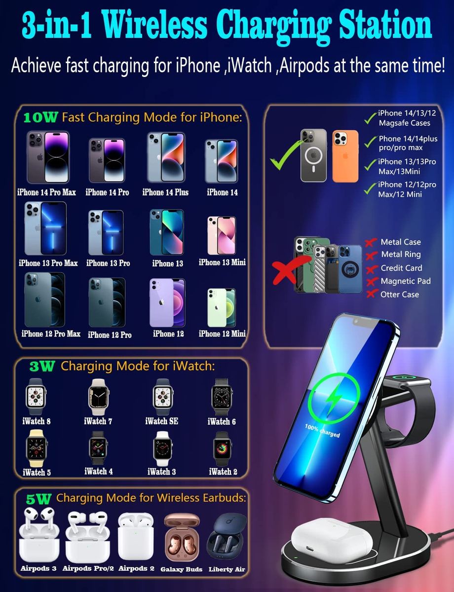 - 【快速无线充电】- 1秒快速充电,强磁吸收。磁性三合一无线充电站 iPhone iPhone 12 13 14 Pro/Max/Mini 最高10W 快速充电,AirPods 2/3/Pro最高5 W,Apple观看 2 / 3/4/5/SE/6/7 最高3W /8/超。