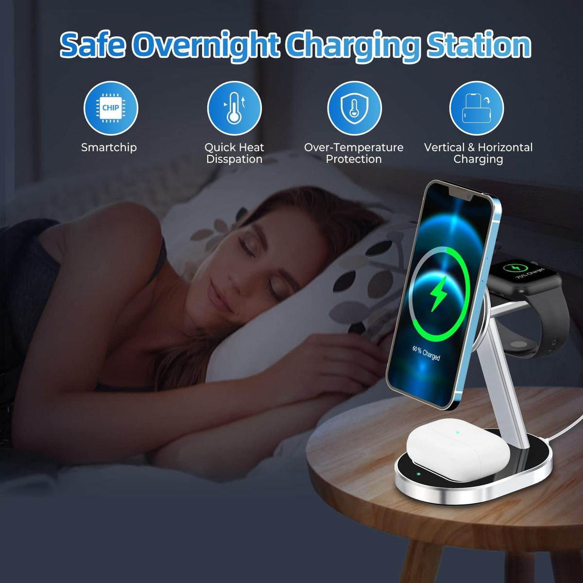 【智能保护和睡友好】- 内置智能芯片,可防止此款 mag 安全充满电器过压/过流/过温,并具有异物检测功能,安全过夜充满电,晚安