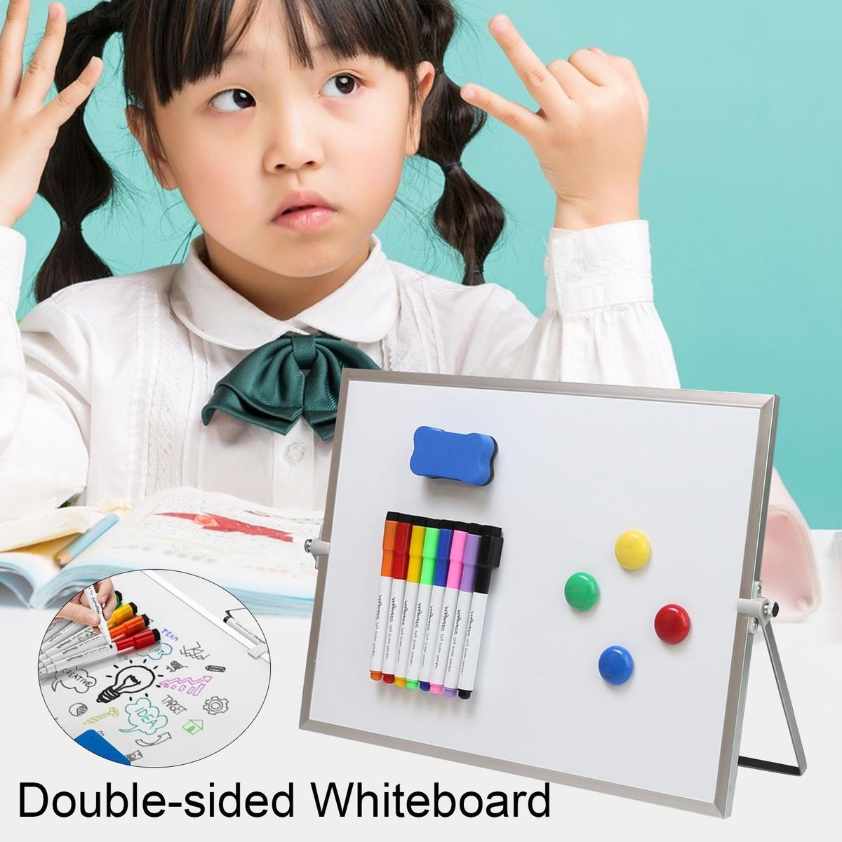 This versatile whiteboard is perfect for a variety of settings including office desks, study tables, nightstands, classrooms, and kitchen counters. its double-sided writing space makes it ideal for various tasks and projects. whether you need it for work records, memos, or children's enlightenment, our whiteboard has got you covered.